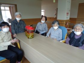2Fフロアで梅酒づくりをしました。今年は施設の梅の木も不作でしたが、実は大きく育っていてよかったです。ぽつぽつと竹串で穴をあけてもらって、分量をしっかり計って、上手にできたと思います。この梅酒は来年、ゼリーにして食べていただきます。