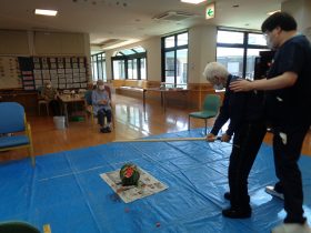 先月は1Fフロアですいか割りをしましたが、今回は2Fフロアでも行いました。怪力の男性ご利用者様のおかげですぐにわれましたが、みんなの掛け声で盛り上がりました。
