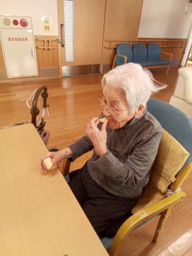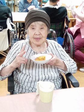 1F、2Fのフロアごとにお茶会クラブがあり、それぞれの食事形態に応じて季節のおやつを楽しんでいただいてます。今月のおやつは、ミスタードーナツのスイートポテトドーナツや、たまごプリン等を召し上がっていただきました。