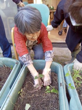 10月下旬、お天気に恵まれたぽかぽか陽気の日に、施設の中庭にあるプランターで栽培した、さつま芋の収穫を利用者様と行いました。
