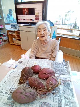 職員と一緒に土を掘ると立派なさつま芋が次々顔を出して「わあ、大きい!」「昔を思い出すねぇ。」等、笑顔と笑い声があふました。さつま芋はずっしり重たく、収穫した利用者様も満足そうなご様子でした。