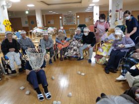 運動会の定番です。「よーいスタート。」と職員の声が響くと、皆様一生けん命に玉を投げ入れ、応援の声も自然と大きくなりました。最後はカゴにいくつ玉が入ったか、声を出して数えます。競技中は笑顔があふれ、「もう一回やりたい!」との声も。勝敗に関係なく、楽しい時間を共有できました。