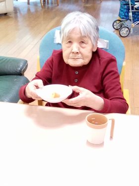 1F、2Fのフロアごとにお茶会クラブがあり、それぞれの食事形態に応じて季節のおやつを楽しんでいただいてます。今月のおやつは、ミスタードーナツのスイートポテトドーナツや、たまごプリン等を召し上がっていただきました。