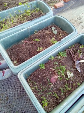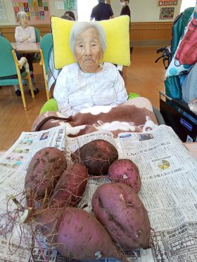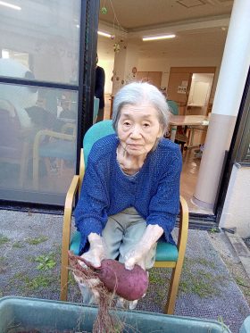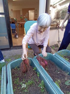 10月下旬、お天気に恵まれたぽかぽか陽気の日に、施設の中庭にあるプランターで栽培した、さつま芋の収穫を利用者様と行いました。