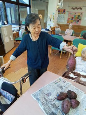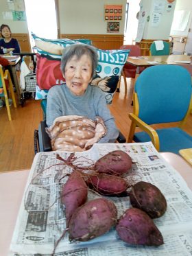 職員と一緒に土を掘ると立派なさつま芋が次々顔を出して「わあ、大きい!」「昔を思い出すねぇ。」等、笑顔と笑い声があふました。さつま芋はずっしり重たく、収穫した利用者様も満足そうなご様子でした。