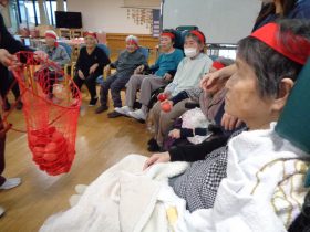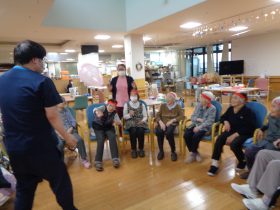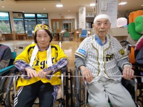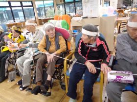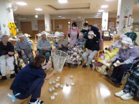 運動会の定番です。「よーいスタート。」と職員の声が響くと、皆様一生けん命に玉を投げ入れ、応援の声も自然と大きくなりました。最後はカゴにいくつ玉が入ったか、声を出して数えます。競技中は笑顔があふれ、「もう一回やりたい!」との声も。勝敗に関係なく、楽しい時間を共有できました。