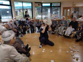 風船を床に落とさずにラリーを続けます。風船がふわりと舞うたびに「いけー!」「ナイス!」と歓声があがり、皆さま夢中になってラリーを楽しんでいました。