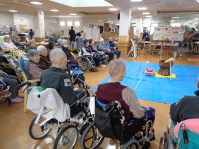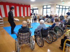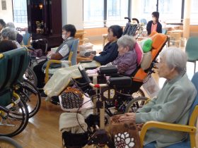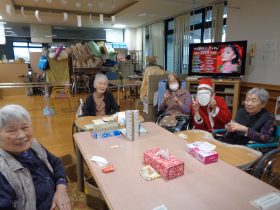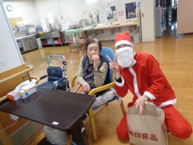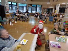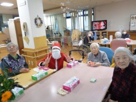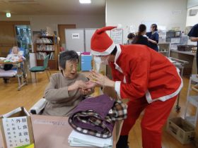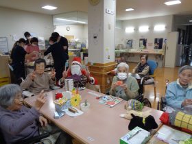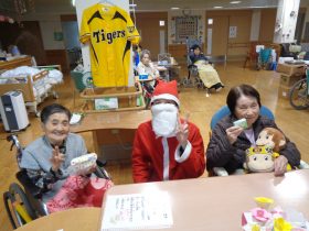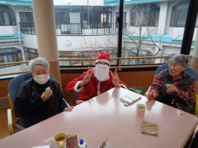 サンタクロース(職員)から、心ばかりのプレゼントをお配りし、皆様大変喜ばれていました。「こういうイベントがあると嬉しいね。」「昔のクリスマスを思い出すわ。」といったお声も多く、あたたかい交流のひとときとなりました。