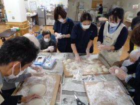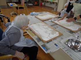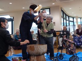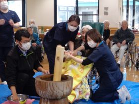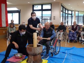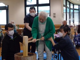 ご利用者様に職員が付き添い安全に配慮した上で、杵でお餅をついていただきました。「懐かしいね。」「昔はよく家でやったよ。」などの声があがり、笑顔があふれる時間となりました。「ぺったん、ぺったん」という響きを楽しみ、昔懐かしい雰囲気を味わっていただきました。
