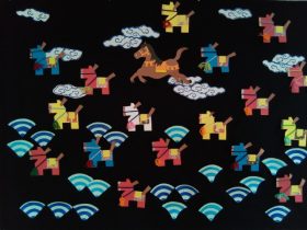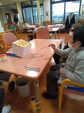 折り紙や画用紙を使って、午が翔け上がる様子を表現しました。毛糸をほどく細かな作業も、利用者さんにお願いすると、あっという間に解かれてしまいました。指先の細かな作業も取り組んで頂きました。