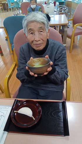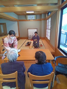 素敵な着物に身を包み、手作りの和菓子とお抹茶が振舞われました。作法を気にされる利用者さんが多く、少し恥ずかしそうにされる様子が見られました。