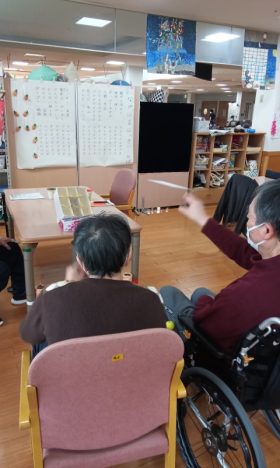 今月のレクリエーションは、『新聞ダーツ!!』牛乳パックで作った9つの的にどちらが先に新聞ダーツを入れる事が出来るかを競いました。ダーツの経験のある利用者さんも、そうでない利用者さんも、皆で楽しみました。競い合っているうちに少しづつ椅子が近づく利用者さんもおられました。