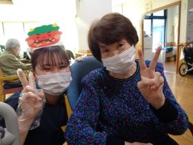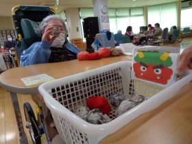 職員が鬼に扮して登場し、利用者の皆さまには「鬼は外、福は内」と元気な掛け声とともに豆まきをしていただきました。(安全面に配慮し、豆の代わりにやわらかいボールを使用しております。)皆さま笑顔で鬼退治をされ、会場は笑い声に包まれました。