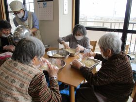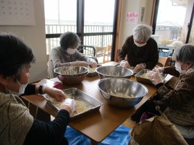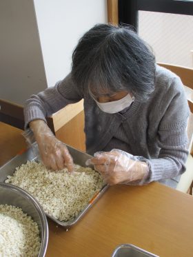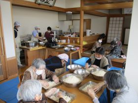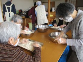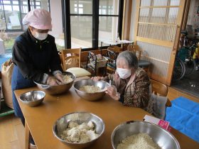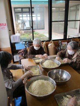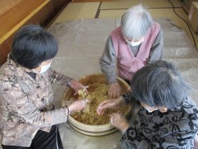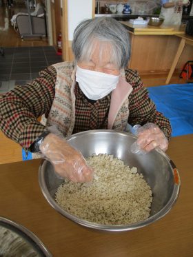 毎年恒例の行事として「味噌づくり」を行いました。やわらかく煮た大豆をつぶし、麹と塩を混ぜ合わせる作業から始まります。大豆をつぶす作業では「子どもの頃に手伝ったわ~。」「こんな塩梅でええんか~?」と、やわらかい大豆の感触を確かめながら、麹と塩を丁寧に混ぜ合わせ、心を込めて仕込みをされていました。真剣な表情の中にも、時折笑い声が響く、和やかな時間となりました。